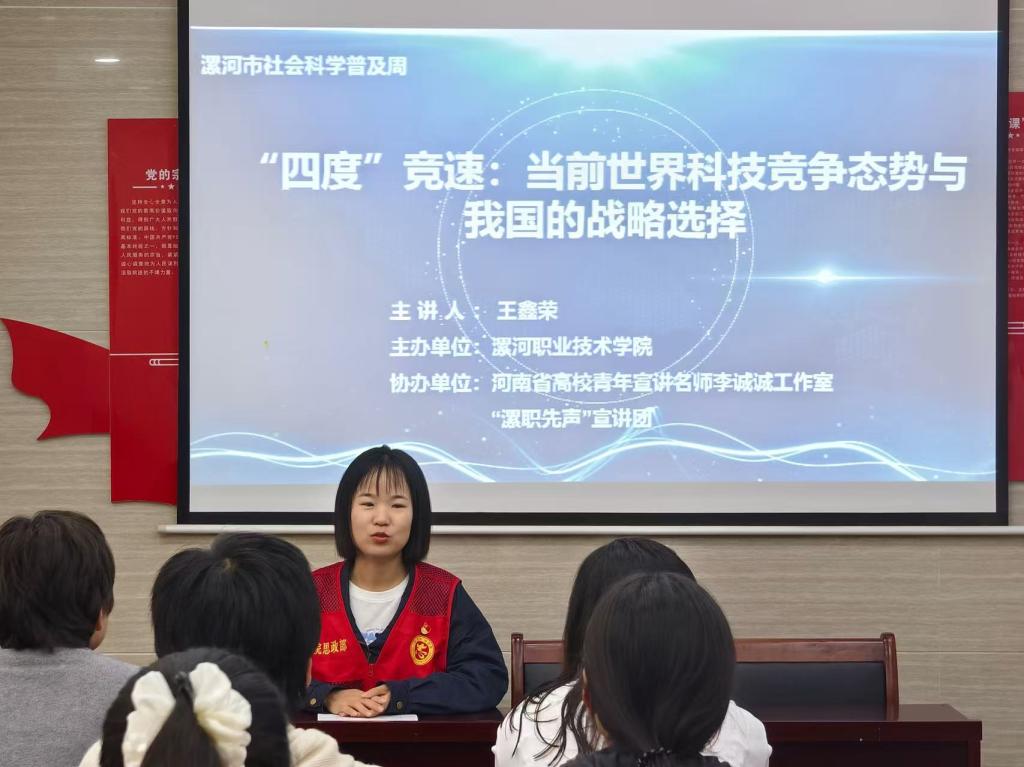 为深入贯彻落实漯河市委宣传部、漯河市社科联《2025年漯河市社会科学普及周实施方案》文件要求,进一步推动我市社会科学普及工作提质增效,9月19日下午,球盟会网页登录,qm球盟会宣讲团走进双龙社区,以《“四度”竞速:当前世界科技竞争态势与我国的战略选择》为主题开展党的创新理论宣讲活动。本次活动由球盟会网页登录,qm球盟会主办,河南省高校青年宣讲名师李诚诚工作室和“漯职先声”宣讲团协办。